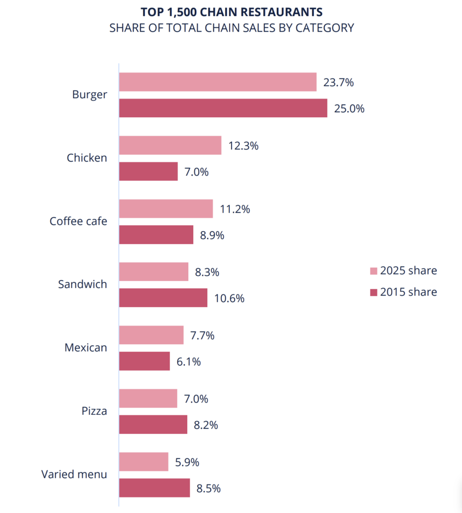 この10年間で最も売上シェアを伸ばしたのはチキン専門チェーンであり、その成長スピードはハンバーガー、ピザ、サンドイッチといった競合カテゴリーを上回っています。これはアメリカにおける健康志向の高まりを象徴する動きと言えるでしょう。チックフィレイ(Chick-fil-A)、レイジング・ケインズ(Raising Cane’s)、ウィングストップ(Wingstop)といったブランドに牽引され、チキンカテゴリーは2025年に米国チェーンレストラン全体売上の12%超を占めると予測されています。これは2015年の7%から大幅にアップしています。
